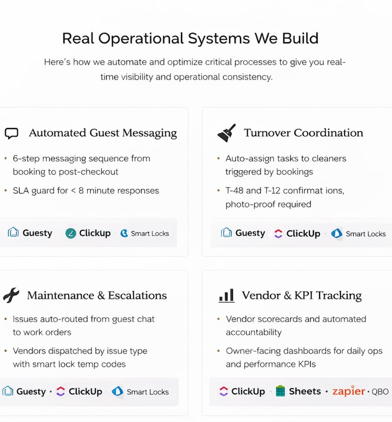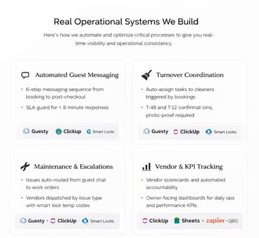 Hands-on expertise in automating workflows, coordinating remote teams, and managing short-term rental systems with practical, proven solutions.